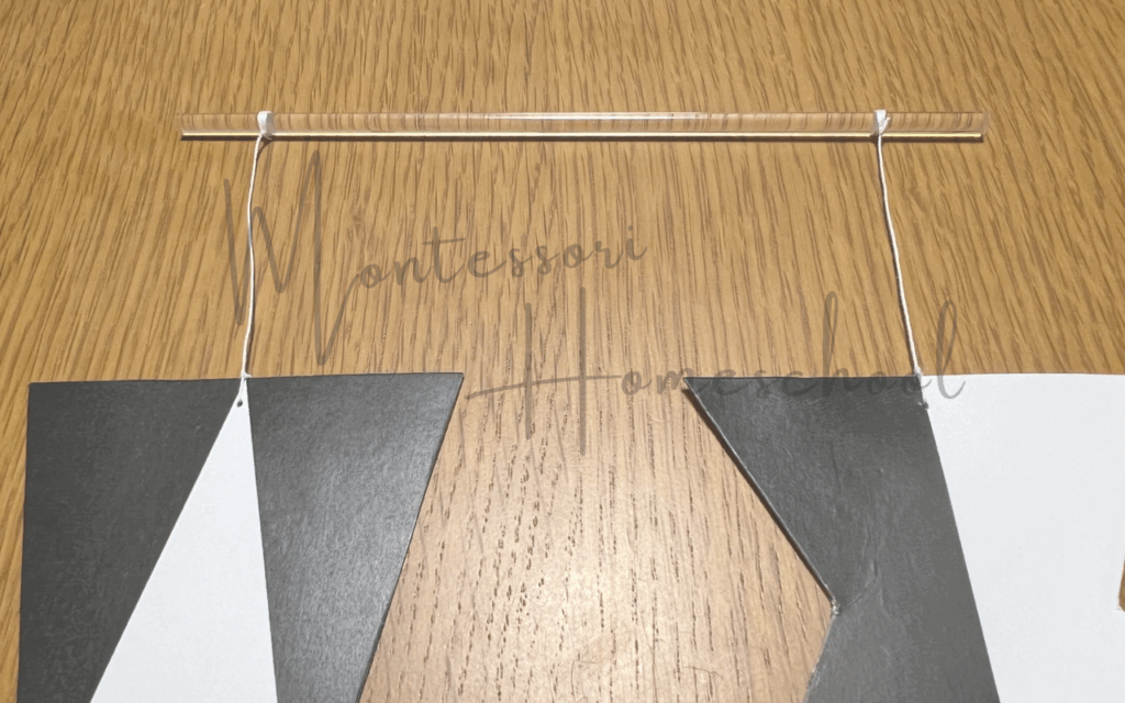 - ねじれた糸を使用し、それぞれの棒が回転できるようにする。ただし、図形同士が触れ合わないように注意。