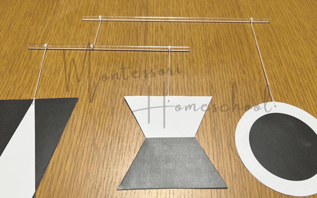 体感的に、世界中のモンテッソーリ教師が紹介しているモビールは、水平上下:V字上下=9:1くらいの割合で使われています。